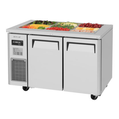 The Turbo Air JBT-48-N refrigerated buffet table uses R-290 hydrocarbon refrigerant to maintain cold temperatures in a range of 33 to 39 degrees Fahrenheit; the interior temperature is shown on an external digital display so operators can ensure ingredients are being safely held. The condensate system is treated with a corrosion-resistant coating, so it runs more efficiently, prevents leaking refrigerant, and does not allow water to overflow. The front grille cover can be easily removed without tools so operators can clean the condenser with the included dust brush. This unit is easy to install and service because of the self-contained refrigeration system and side-mounted compressor.