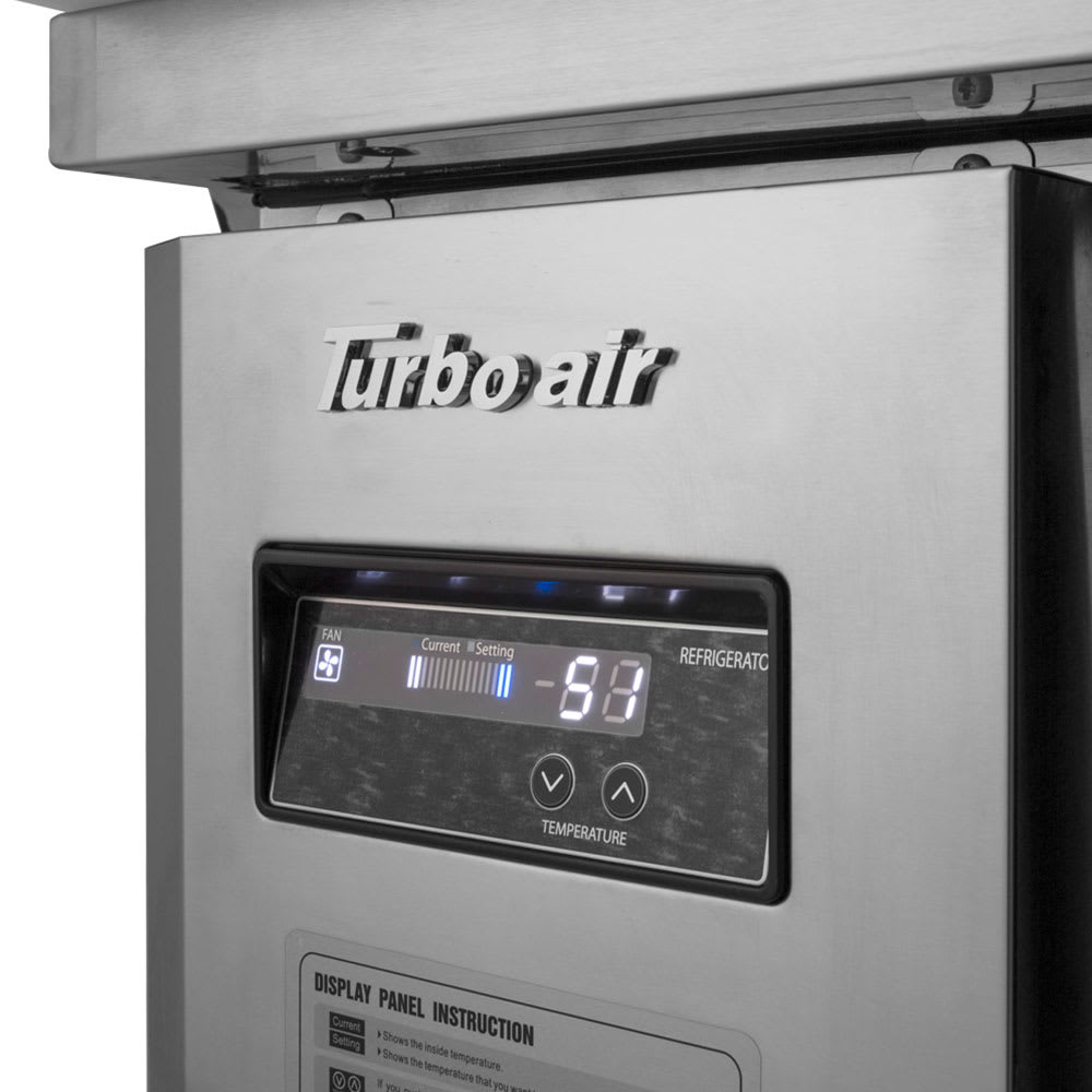 Mounted on the side of the unit, the refrigeration system can be accessed for cleaning and maintenance. A removable front grille provides condenser access and includes a cleaning brush kit. The Turbo Air JST-36-N prep table operates from 33 to 39 degrees Fahrenheit and uses eco-friendly hydrocarbon refrigerant. A digital control system monitors and digitally displays it.