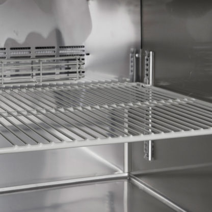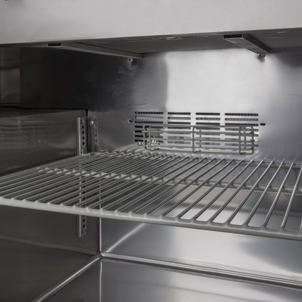 The Turbo Air JST-36-N prep table holds eight sixth-size, 4-inch-deep pans in its rail compartment, which can be accessed for ingredient prep and final product assembly. A full-length, 91/2-inch-deep cutting board sits on the front of the unit, and an adjustable wire shelf provides additional storage space in the cabinet base. LED lighting brightens the cabinet’s interior while its stainless steel floor facilitates cleaning.