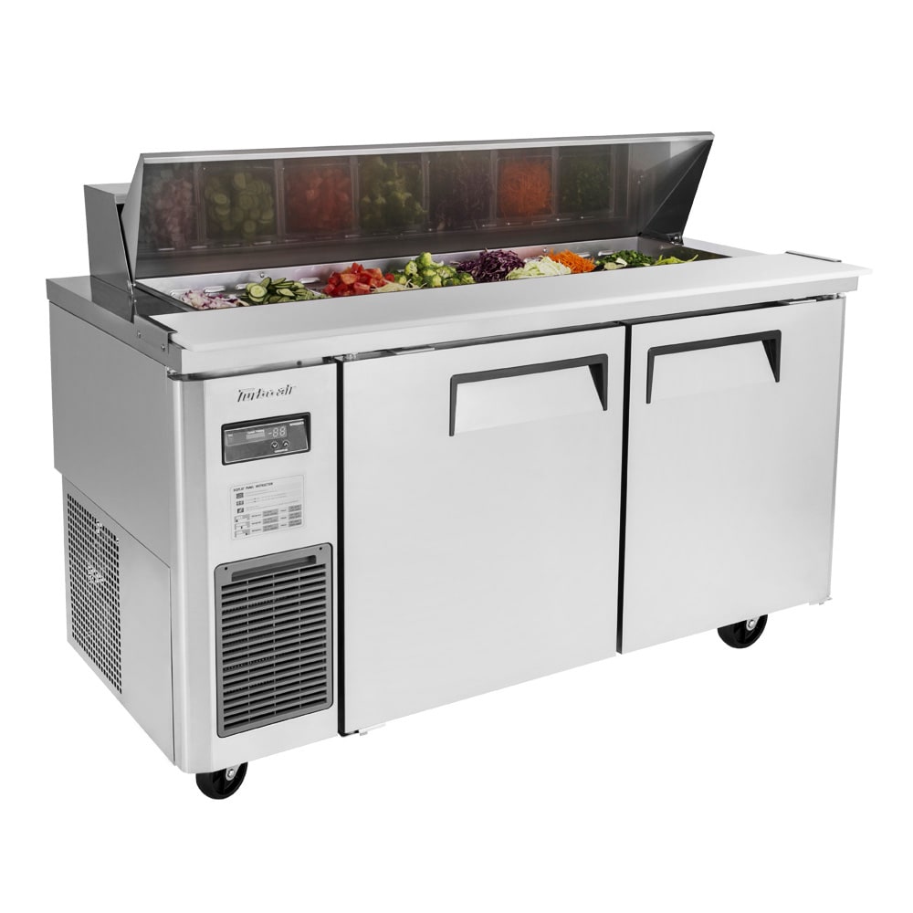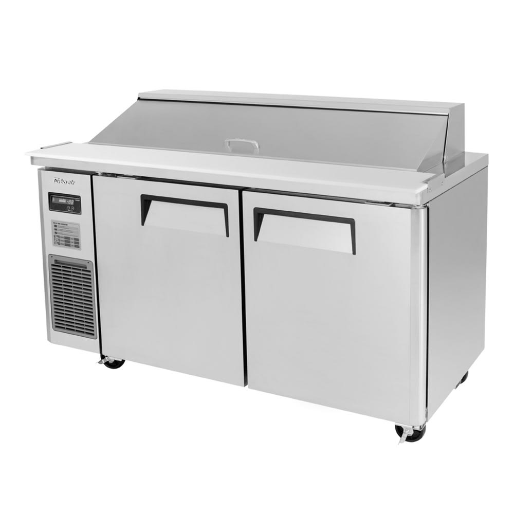 The Turbo Air JST-60-N prep table includes 14 sixth-size pans in its top compartment. Ingredients in these pans can be prepped and added to salads or sandwiches on the full-length cutting board. Additional storage space is available in the cabinet base on two adjustable wire shelves. In this section, LED lighting provides visibility while the aluminum and stainless steel construction enhances durability.