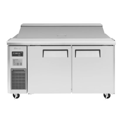 The doors are ergonomically designed and self-close to keep cold air inside the cabinet. Temperatures in the Turbo Air JST-60-N prep table range from 33 to 39 degrees Fahrenheit and are maintained by R290 hydrocarbon refrigerant. A digital control system and display enable the operator to monitor the refrigeration system.