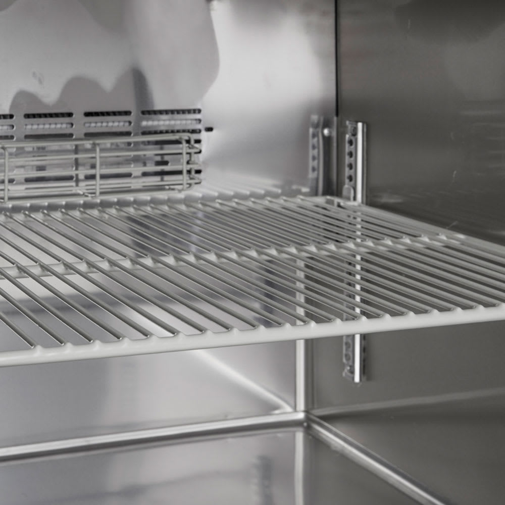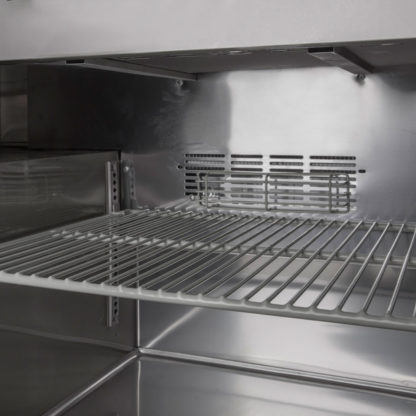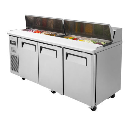 Made of aluminum, the interior sides, door liners, and back can withstand heavy use, and the stainless steel floor facilitates the cleaning process. The Turbo Air JST-72-N prep table operates at temperatures between 33 and 39 degrees Fahrenheit. Its R290 hydrocarbon refrigerant is more environmentally friendly than traditional refrigerants.