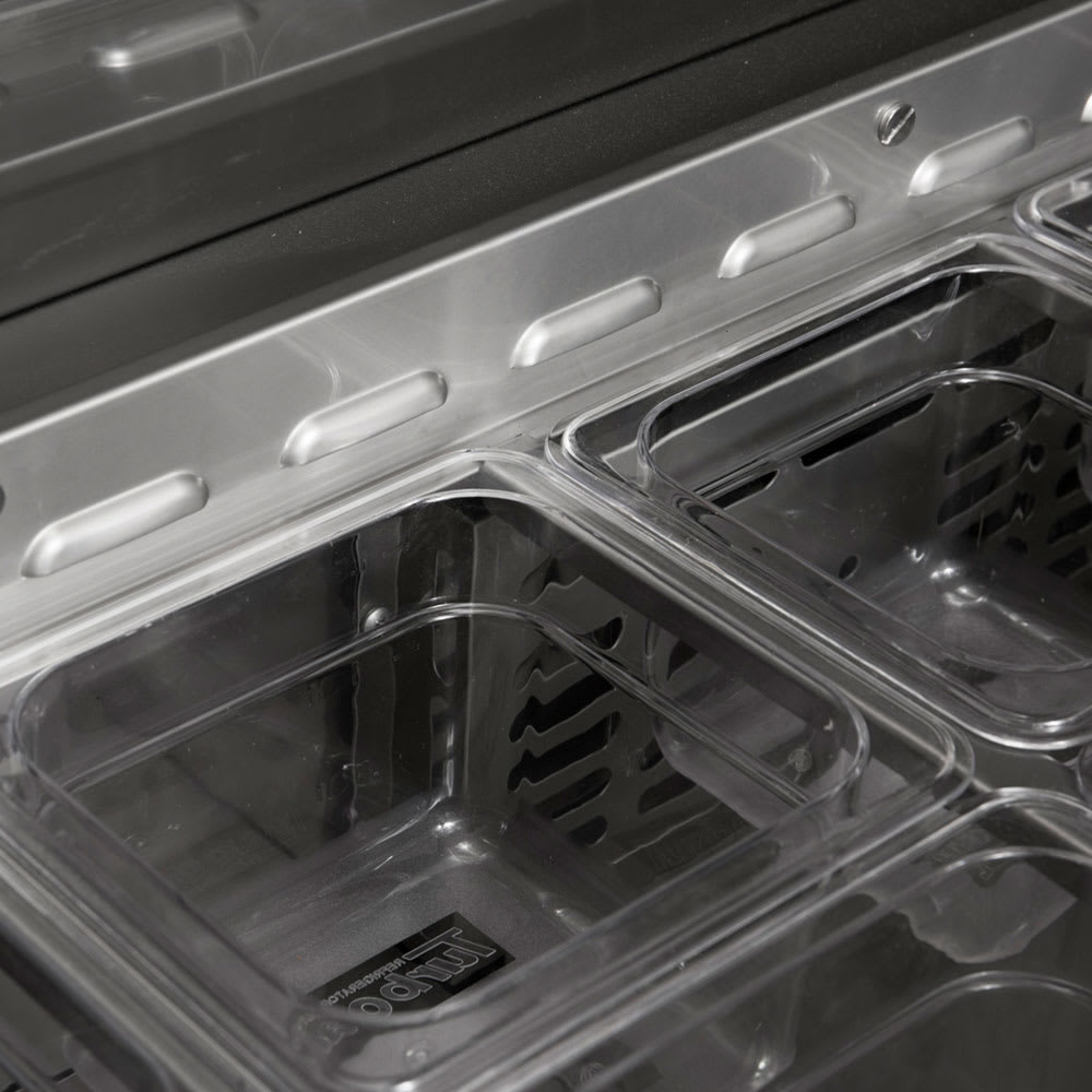 In the top section of the Turbo Air JST-72-N prep table, 18 sixth-size pans hold ingredients that can be added to salads and sandwiches on the full-length cutting board. Additional pans can be stored in the cabinet base on three adjustable, coated shelves. Lighting in the cabinet base enhances visibility so that operators can find necessary ingredients.