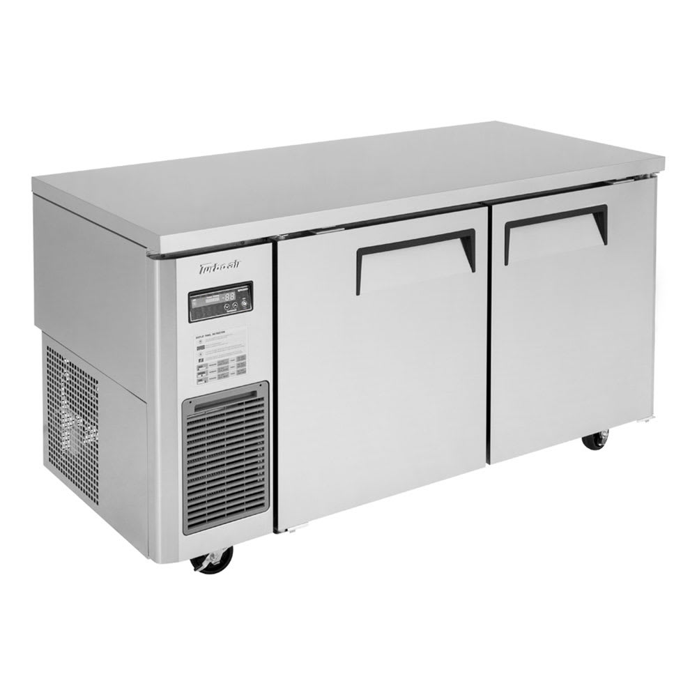 For condenser cleaning, the Turbo Air JUF-60-N J series undercounter freezer has a front grille that is removable without tools and includes a condenser cleaning brush. A front-breathing compressor is positioned on the side, which facilitates serving. Product is supported on two polyethylene coated wire shelves and the stainless steel floor, while the interior cabinet is illuminated with LED lighting. Four swivel casters enable transportation, and the front set locks to provide a stable workspace. To resist dents and scratches, the Turbo Air JUF-60-N two-section undercounter freezer exterior is made of stainless steel. Its interior side, back, and door liners are made of aluminum, and the user can control the freezer temperature using the digital monitor system.