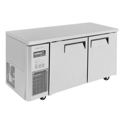 The Turbo Air JUF-60S-N J series undercounter freezer has two swing doors with comfortable handles and magnetic gaskets to prevent cold air from escaping. A side-mounted compressor enables the unit to be serviced without moving. Its stainless steel exterior resists scratches and dents, while its aluminum interior resists corrosion. Operators can remove the front grille without tools to clean the condenser with an included brush kit. The Turbo Air JUF-60S-N two-section undercounter freezer has four swivel casters for movement and locks on the front set to secure the unit in place. Its interior is illuminated with LED lighting and has two polyethylene-coated, adjustable wire shelves.