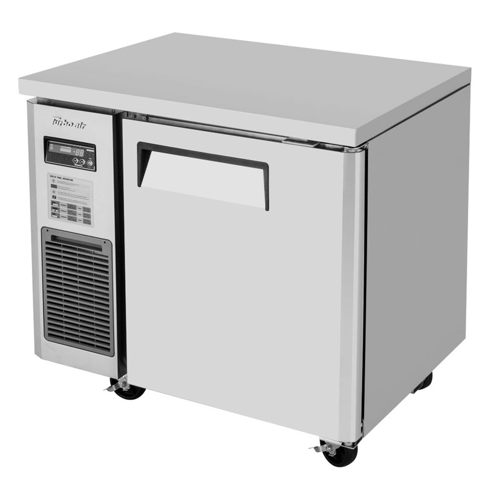 Made of corrosion-resistant aluminum and resilient stainless steel, the Turbo Air JUR-36-N6 one-section refrigerator is suitable for intensive use. Its single shelf is adjustable and coated with polyethylene to provide additional strength and rust resistance. To ensure cold air remains in the cabinet, it features high-density polyurethane insulation as well as magnetic door gaskets.