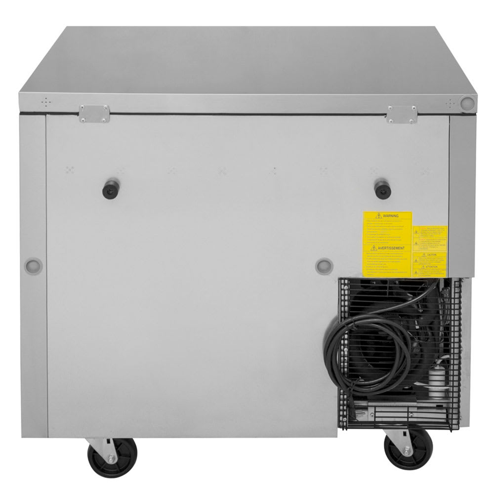 This undercounter refrigerator features one solid door with an ergonomic, recessed handle to facilitate opening and closing. Its swivel casters offer maneuverability, enabling operators to wheel it away for service or cleaning. To prevent buildup of condensation and resist corrosion, it is designed with a hot gas condensate system.