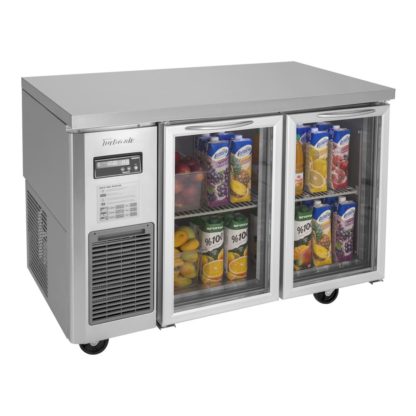 The Turbo Air JUR-48-G-N undercounter refrigerator includes two swinging doors with two coated wire shelves for storage, and the self-closing doors have standard locks and easy-grip handles to ease opening. Removable without tools for cleaning, the magnetic door gaskets are built from one piece, and to increase visibility, the interior is lit with LED lights. Holding temperatures between 33 and 39 degrees Fahrenheit, this unit has a fan control function to shut off the fan when the door is open, helping prevent heat from being drawn inside the cabinet. Operators can select the specific temperature they want with digital controls.