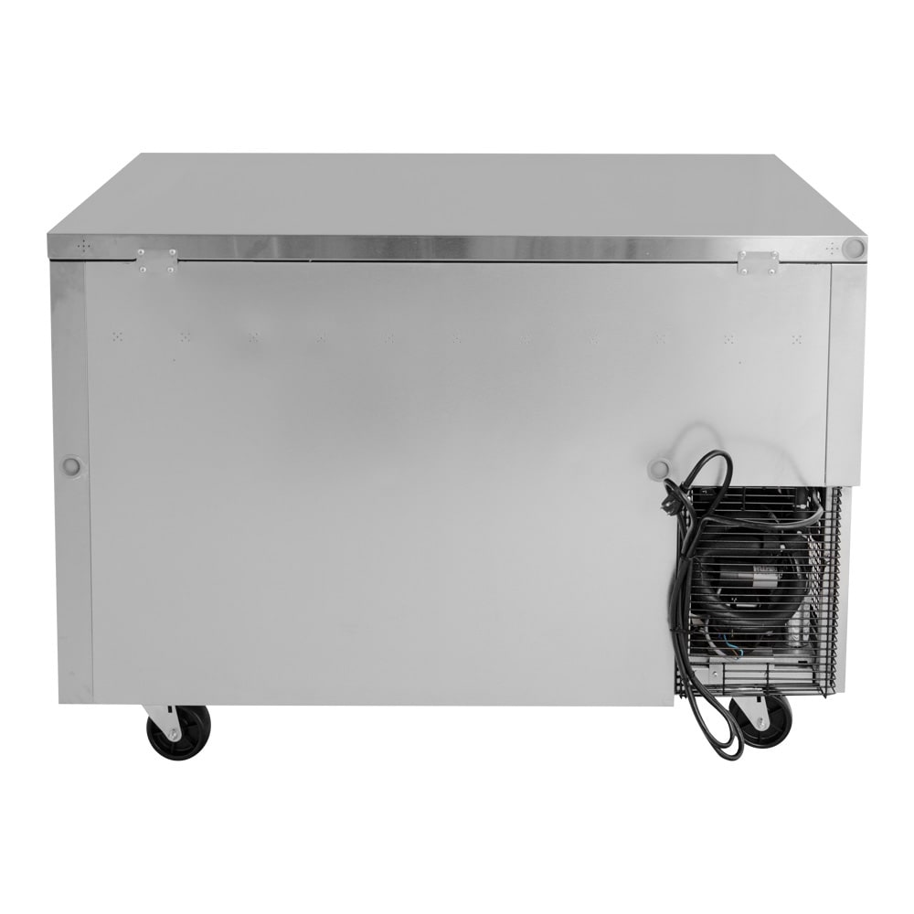 The self-contained refrigeration system in the Turbo Air JUR-48-G-N undercounter refrigerator is maintained by a hot gas condensate system that prevents the overflow of condensate water as well as corrosion. Including a brush kit for cleaning, the condenser is located behind the front grille, while the compressor unit is front breathing and side mounted, providing convenient access. Cooled by R290 hydrocarbon refrigerant, the temperature is controlled digitally with a monitoring system and maintained with polyurethane insulation.