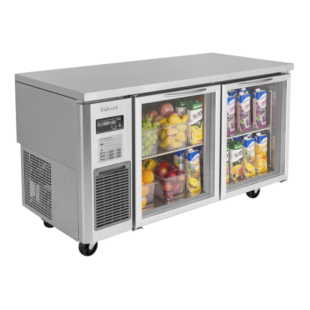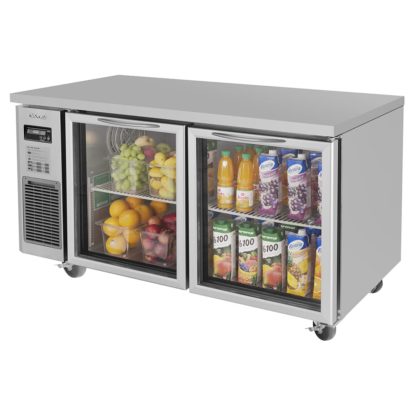 To offer corrosion resistance with frequent exposure to moisture, the interior of the Turbo Air JUR-60-G-N two-section refrigerator is constructed of aluminum with a stainless steel floor. Its glass doors and LED interior lighting offer visibility in the cabinet, enabling users to view the contents without causing cold air to escape. Using environmentally friendly R290 hydrocarbon refrigerant, it maintains temperatures between 33 and 39 degrees Fahrenheit.