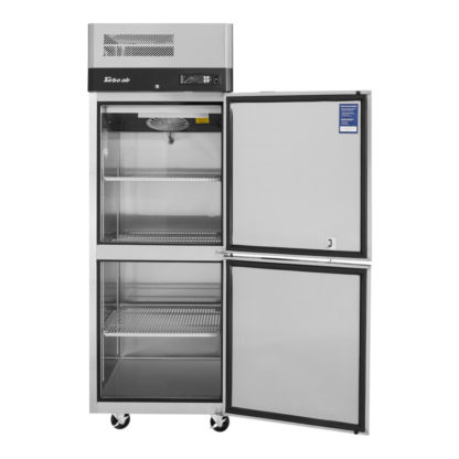 The Turbo Air M3F24-2-N one-section reach-in freezer accommodates a variety of product heights since the three polyethylene-coated wire shelves are adjustable. To keep the stored contents visible, the interior has LED lighting. With aluminum sides and a stainless steel floor, the interior is durable and easy to clean. The half doors open easily thanks to the pressure release device that eliminates vacuum pressure, but the doors can be locked if access to the unit needs to be restricted. The fan automatically delays when the doors are opened, so warm air is not sucked in and circulated in the cabinet.