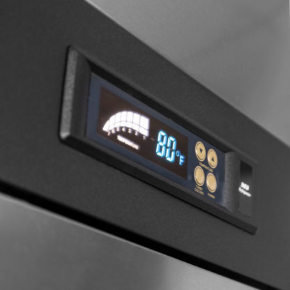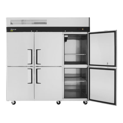 The Turbo Air M3F72-6-N three-section reach-in freezer has a top-mounted compressor that is kept away from debris and dust on the floor. Its self-cleaning condenser brushes dust away daily to prevent system failures and prolong the life of the unit. The six half-size swing doors have locks and magnetic gaskets to keep cold air from escaping the cabinet, where products are held on nine adjustable polyethylene-coated wire shelves. The Turbo Air M3F72-6-N three-section reach-in freezer has a sleek design and is made of durable stainless steel and aluminum, which resist dents and scratches. Six casters enable the freezer to move, and the front set has stabilizing locks. Several controls like door alarms and self-diagnosis help the operator regulate the unit’s settings.