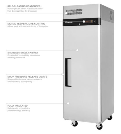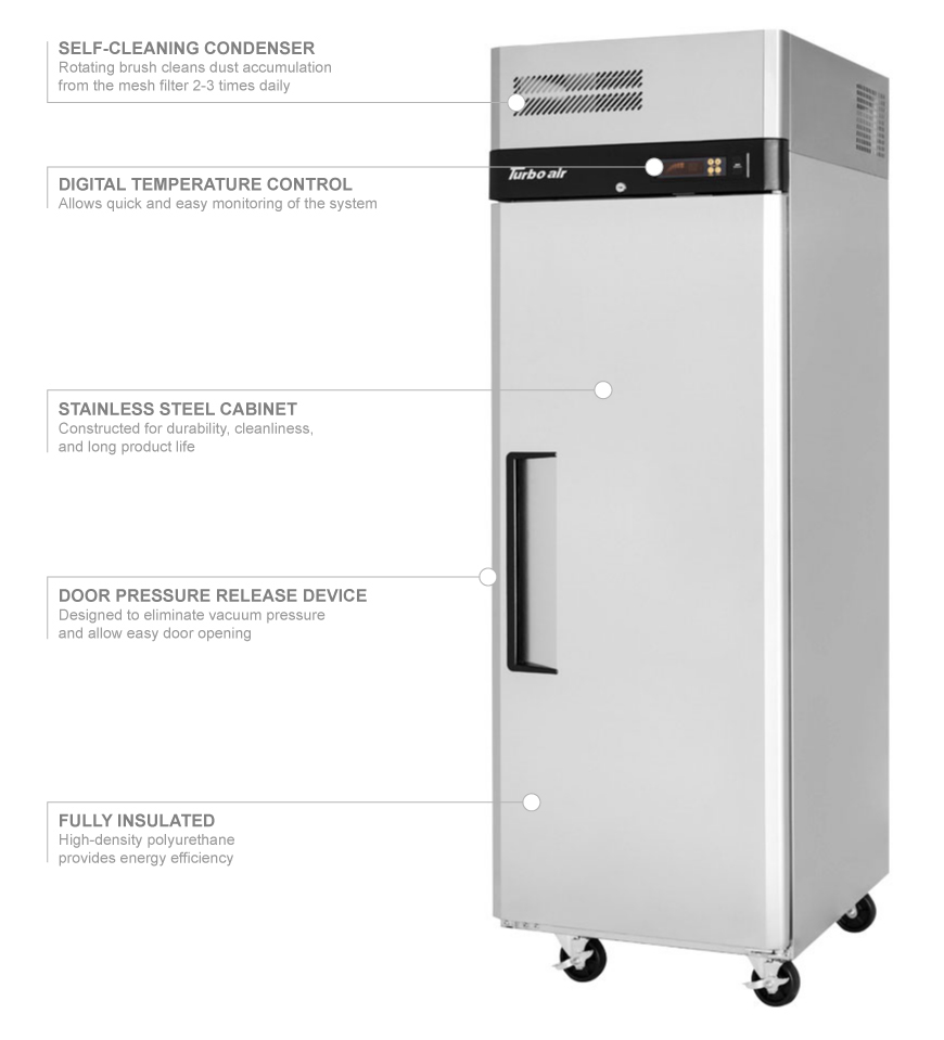Incredibly easy to maintain, this unit features Turbo Air’s revolutionary self-cleaning condenser system, which automatically cleans the condenser by moving a rotating brush up and down across its surface 2 to 3 times per day. Not only does this process eliminate the need for your employees to manually clean the condenser every few weeks, but it prevents dust from building up on the coils. In turn, this reduces the stress on the compressor and the risk of it breaking down, resulting in fewer maintenance calls and higher overall energy efficiency.