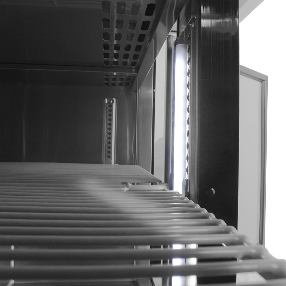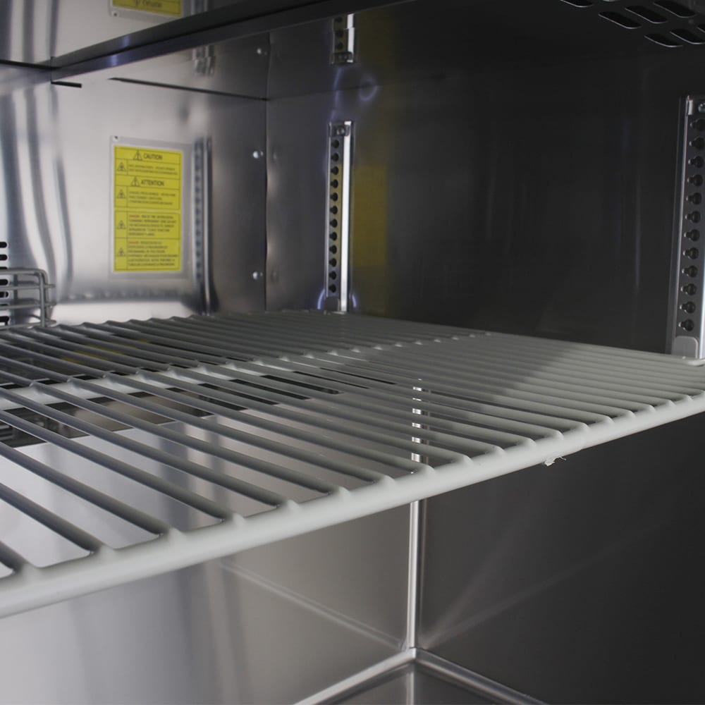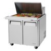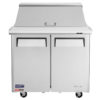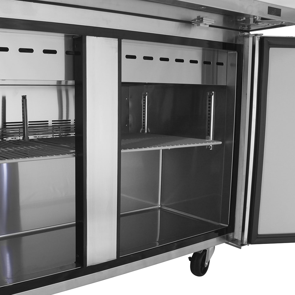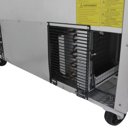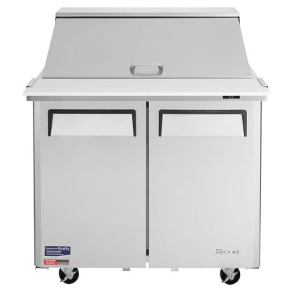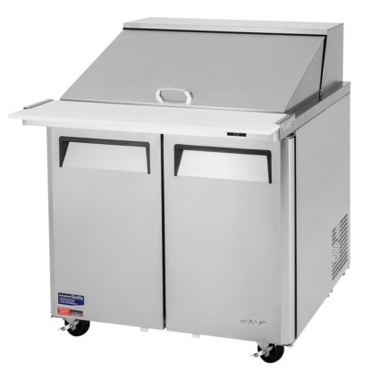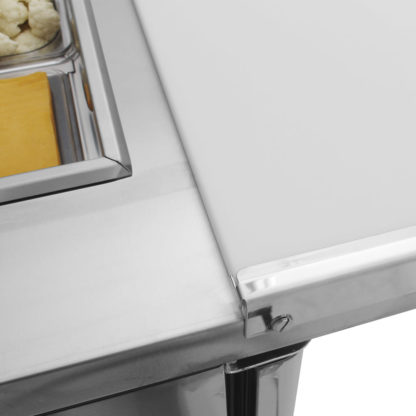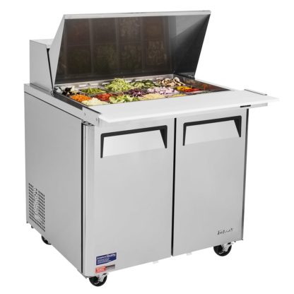 The Turbo Air MST-36-15-N6 prep table holds 15 sixth-size pans in the top compartment, which can be enclosed with an insulated pan cover to help retain cool temperatures when ingredients aren’t being used. The cold bunker system allows air to flow around the top, bottom, front, and rear of the compartment. The top compartment is not connected to the reach-in cabinet, so ingredients will not spill into the cabinet below. Two 15-inch by 17-inch wire shelves hold product in the aluminum cabinet and are adjustable to provide space for different item heights. LED lighting illuminates the interior, so staff members can easily find the ingredients they need.