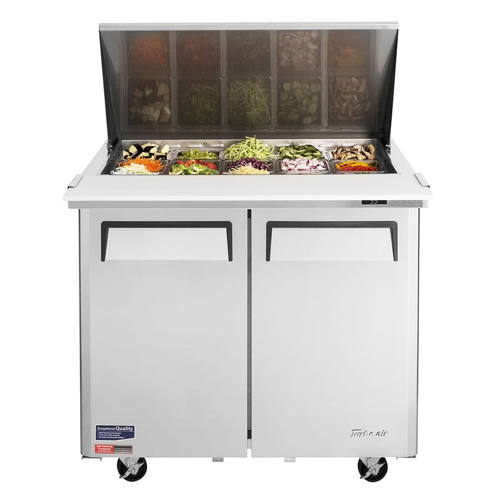Cold temperatures in the unit are maintained with R-600A refrigerant and range from 33 to 39 degrees Fahrenheit. The external digital display allows operators to monitor the internal temperature to ensure food is being held properly. The Turbo Air MST-36-15-N6 prep table has a self-contained refrigeration system with components that are easily accessible for both service and maintenance. However, the self-cleaning condenser automatically removes accumulated dust from itself two to three times every day.