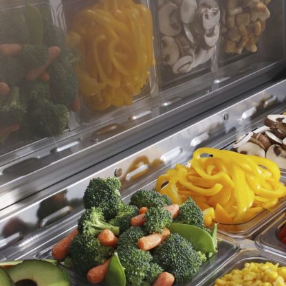 - Cold bunker system allows air to efficiently flow through the pan compartment to cover the front, rear, top, and bottom, keeping temperatures below 41 degrees F