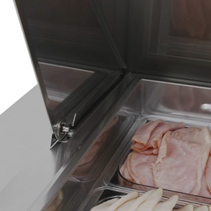 M3 Series Sandwich/Salad-Mega Top Unit, two-section, rear mount self-contained compressor, 11.0 cu. ft., 15-pan top opening with hood, (2) swing doors, (2) PE coated wire shelves, 9-1/2″ deep cutting board with side rail, digital temperature control, self-cleaning condenser, cold bunker system, stainless steel top, front & sides (galvanized steel back & bottom), aluminum interior, stainless steel floor & ABS door liner, LED interior lighting & fan control, R600a Hydrocarbon refrigerant, 1/5 HP, 115v/60/1-ph, 2.9 amps, NEMA 5-15P, cETLus, ETL-Sanitation