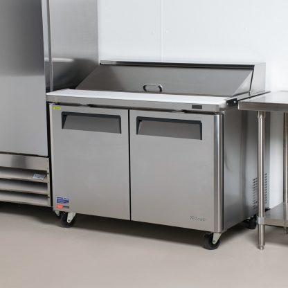 Offering extra pan space and storage capacity, this Turbo Air MST-48-18-N 48″ M3 series mega top refrigerated sandwich prep table helps you deliver the freshest salads and sandwiches! Perfect for sandwich shops and cafes that offer a wide selection of ingredients and toppings, this mega top adds efficiency and convenience to your establishment. Equipped with a 9 1/2″ wide polyethylene cutting board and 2 adjustable, polyethylene-coated wire shelves, this prep table provides ample work space and storage. This unit also comes with (18) 1/6 size, 4″ deep condiment food pans for the top section to keep your ingredients organized and easily accessible. Sandwich prep tables make it easy to keep your refrigerated ingredients close by as your staff works to assemble made-to-order subs and sandwiches.