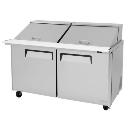 The Turbo Air MST-60-24-N sandwich prep table uses a forced-air system to circulate cold air throughout the pan compartment, creating a shield that maintains temperatures under 41 degrees Fahrenheit. Insulated pan covers keep cold air inside the compartment when they are closed, and there are (24) 4-inch-deep, sixth-size pans included. To create a convenient prep area, a 91/2-inch-deep cutting board runs along the width of the unit.