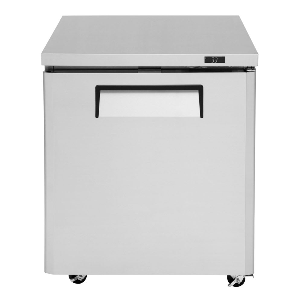 To prevent the system from overheating, there is a self-cleaning device on the condenser that removes harmful dust and debris daily. The self-contained refrigeration system has all the components built together for easy servicing and installation. Since the evaporator is coated, it resists corrosion. Temperatures range from 33 to 38 degrees Fahrenheit and are maintained by R290 hydrocarbon refrigerant. The Turbo Air MUR-28-N undercounter refrigerator has a digital display so the operator can monitor the internal temperature.