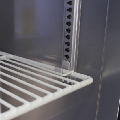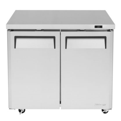 Constructed of durable stainless steel, the Turbo Air MUR-36-N6 undercounter refrigerator can be wiped clean and insulated with high-density polyurethane. Both doors are self-closing with easy grip handles and magnetic, removable gaskets. Two polyethylene-coated wire shelves are located inside the cabinet for storage, and to increase visibility, the interior of this unit is illuminated with LED lights.