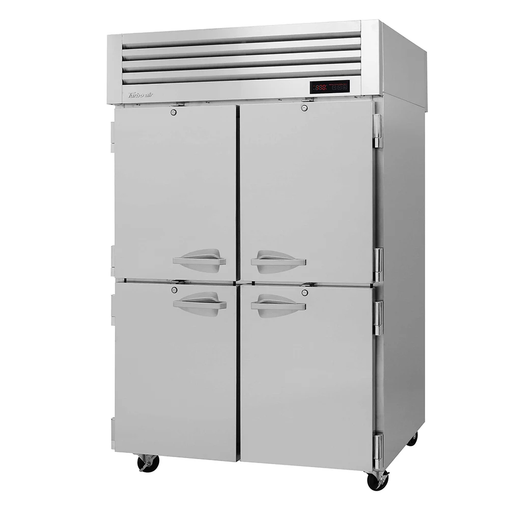 To keep food and prepared meals warm until needed, the Turbo Air PRO-50-4H heated cabinet preserves them at a temperature between 140 and 180 degrees Fahrenheit. Its solid half-doors enable access to selective parts of the cabinet, reducing the amount of heat lost in the process. The doors self-close when not in use and can be fixed open at 120 degrees for loading or unloading.