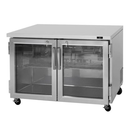 Insulated with polyurethane, the Turbo Air PUR-48-G-N undercounter refrigerator retains chill and reduces energy use. It has two sections and 12.2 cubic feet of interior space, which can be accessed behind two doors. Made of glass, users can see inside the cabinet without opening the doors, which have locks to secure product after hours. Magnetic gaskets on the doors provide a tight seal to trap cold air.