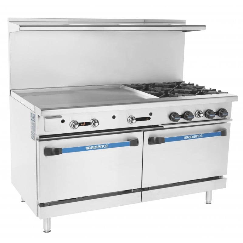 Radiance Restaurant Range, liquid propane gas, 60″, (4) 32,000 BTU open burners, 36″ griddle (left side), (2) standard ovens with (1) rack, stainless steel front, sides & back riser lift-off high shelf, full stainless steel oven interior, adjustable oven thermostat, 26.3″ D standard, 6″ stainless steel adjustable legs standard, regulator included, total 257,000 BTU, CSA, CSA Flame, CSA Star, CSA-Sanitation
