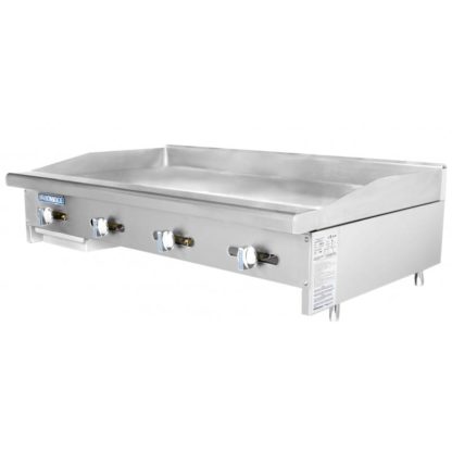 The Turbo Air TAMG-48 Radiance manual control griddle is made of stainless steel to withstand kitchen environments. It has a 4-inch-wide front top edge for resting plates and utensils, while its 4-inch-high backsplash and tapered side splashes help prevent hot oil and food particles from splashing on the counter. At the back of the unit, a 3/4-inch rear gas connection and gas pressure regulator manage the griddle’s flow of LP gas or convertible natural gas.