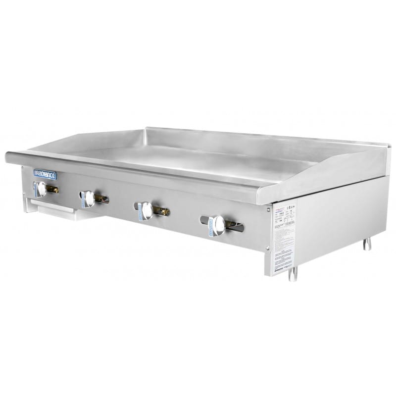 Radiance Griddle, countertop, liquid propane gas, 48″W x 30″D, stainless steel front & side, built-in stainless steel splash guard, 3/4″ thick highly polished steel griddle plate, (4) burner, aluminized U shaped burners & manual controls for every 12″, individual heat resistant on-off knob, 3″ wide front grease trough, removable grease pan, bullnose stainless steel front extension, 2″ stainless steel standard legs, regulator included, total 88,000 BTU, CSA, CSA-Sanitation