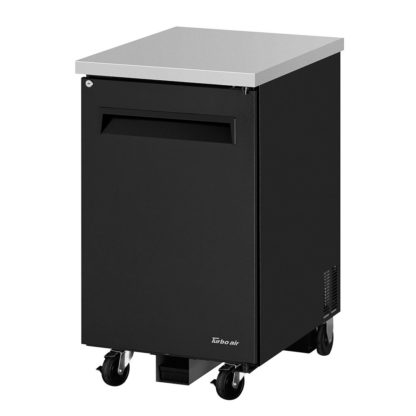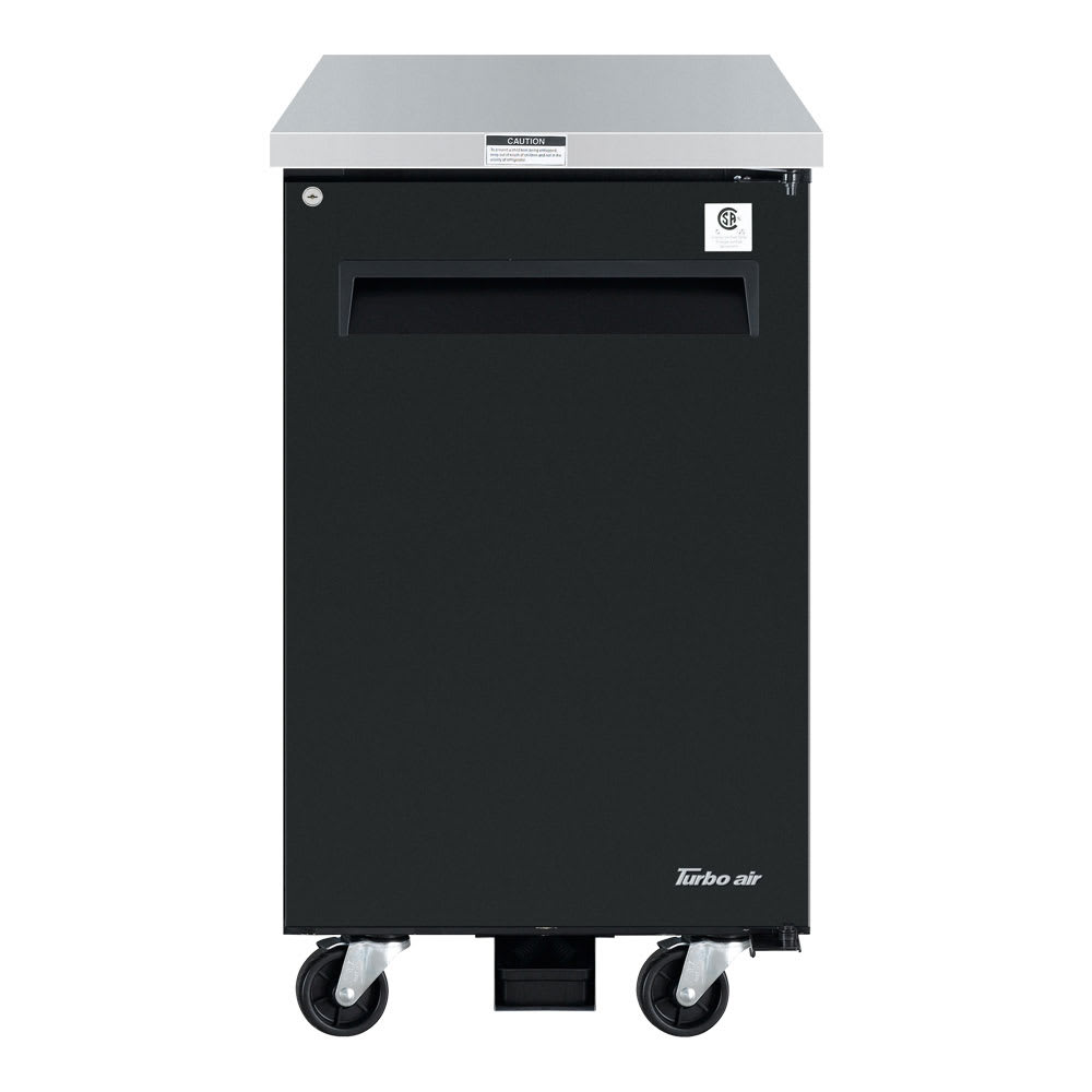 The exterior is constructed of black, vinyl-coated galvanized steel for a sleek finish, and the self-closing door is equipped with handles that are easy for users to grip. The Turbo Air TBB-1SB-N6 bar refrigerator has a forced-air cooling system that balances the temperature to ensure it maintains 33 to 38 degrees Fahrenheit. The side-mount compressor unit simplifies maintenance without removal since it is easy to access.