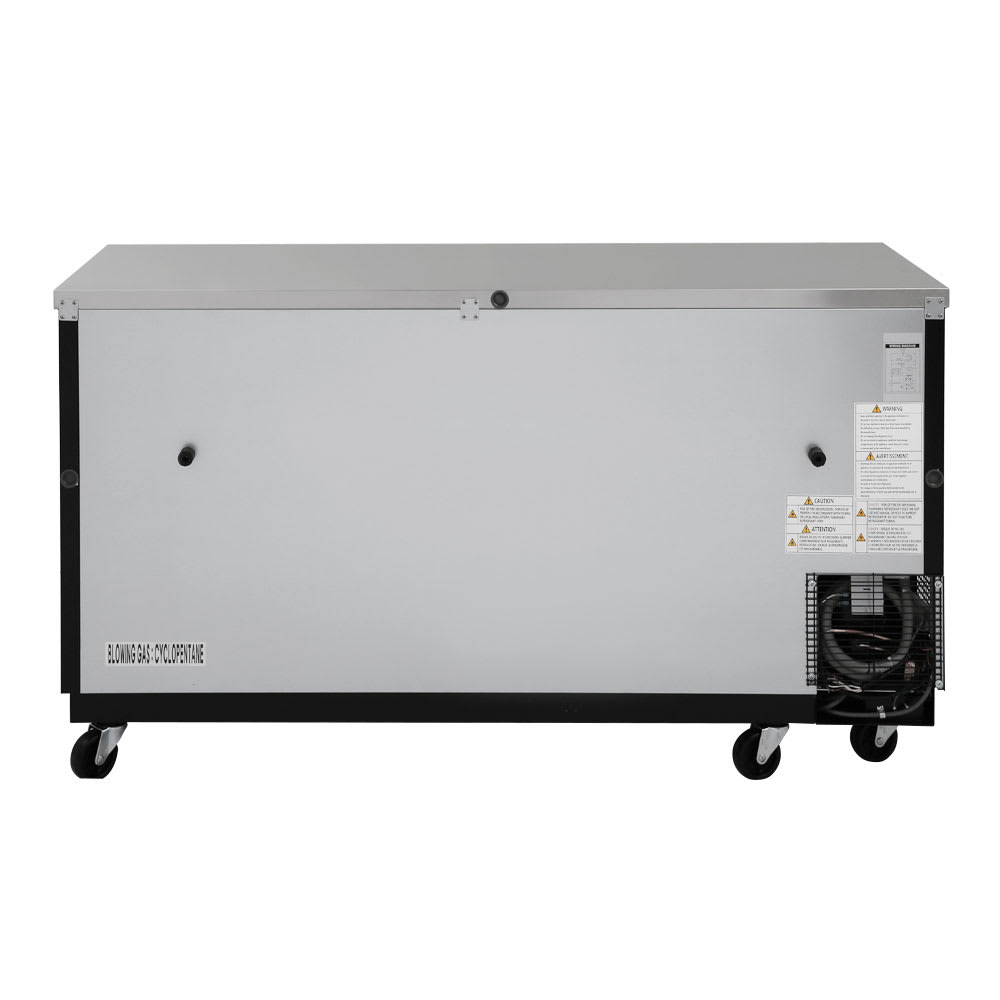 The Turbo Air TBB-24-72SB-N6 three-section bar refrigerator is cooled by R600A hydrocarbon refrigerant to hold product at temperatures from 33 to 38 degrees Fahrenheit. A durable stainless steel interior and countertop resist corrosion, and the exterior has a black coating to resist dents and scratches. Six adjustable shelves hold product in the Turbo Air TBB-24-72SB-N6 three-section back bar cooler, and three half-barrel kegs fit in the cabinet when the shelves are removed.