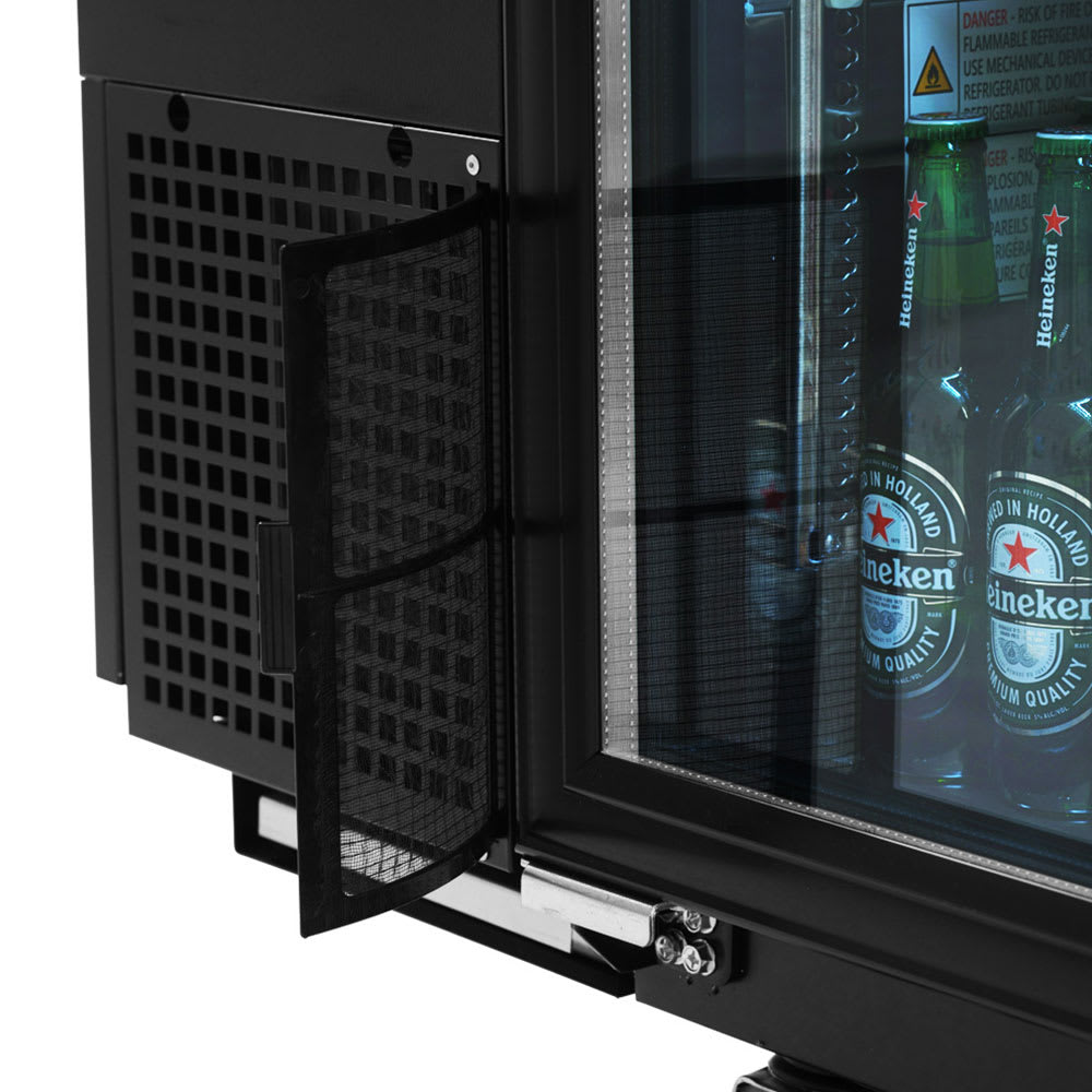 The Turbo Air TBB-24-72SG-N back bar refrigerator keeps temperatures between 33 and 38 degrees Fahrenheit. With a forced air cooling system, balanced temperature is distributed, and the cabinet is cooled quickly. Thanks to its side-mounted design, the compressor is accessible for servicing. The air filter can be removed for cleaning. The evaporator is treated with a coating to resist corrosion.