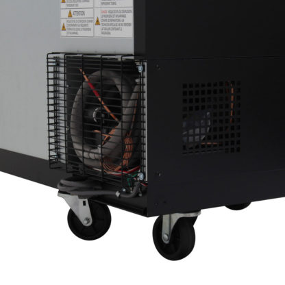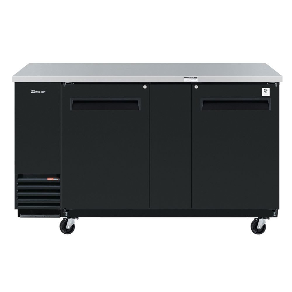 The Turbo Air TBB-3SB-N6 two-section bar refrigerator has a self-contained, side-mounted refrigeration system that is easy to access and service. It uses R-600A refrigerant to keep temperatures between 33 and 38 degrees Fahrenheit. Cool temperatures are evenly distributed with the forced-air cooling system. Overheating that can lead to system failure is prevented since the self-cleaning brush removes dust from the condenser two to three times every day.