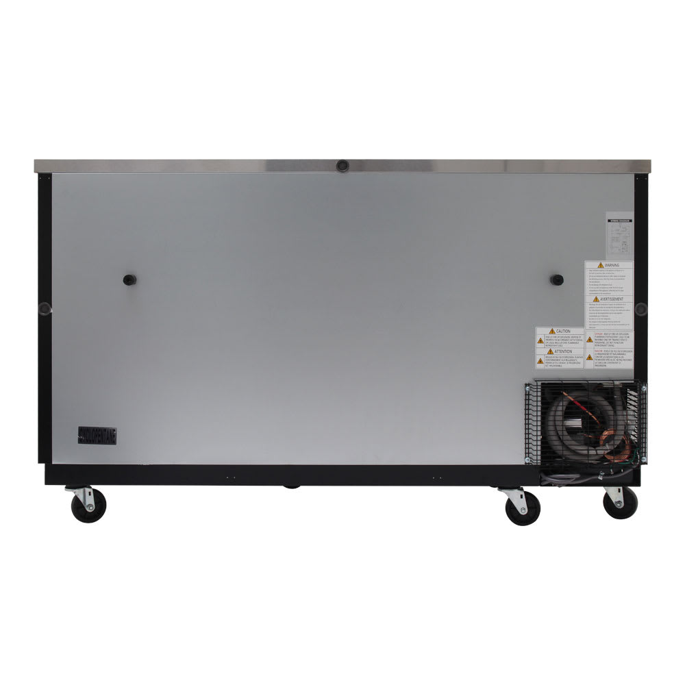 Back Bar Cooler, two-section, glass doors, 69″W x 27-1/4″D x 37-1/8″H, 23 cu.ft., self-cleaning condenser equipped, self-contained, side mount, front breathing, (6) PE coated adjustable shelves, LED interior light, black laminated exterior & stainless steel countertop, stainless steel interior floor, powder coated galvanized steel interior top & walls, (2) glass doors-double pane with locks, Low-E glass, R290 Hydrocarbon refrigerant, 1/3 HP, 115v/60/1-ph, 2.8 amps, cord, NEMA 5-15P, cETLus, ETL-Sanitation, ENERGY STAR