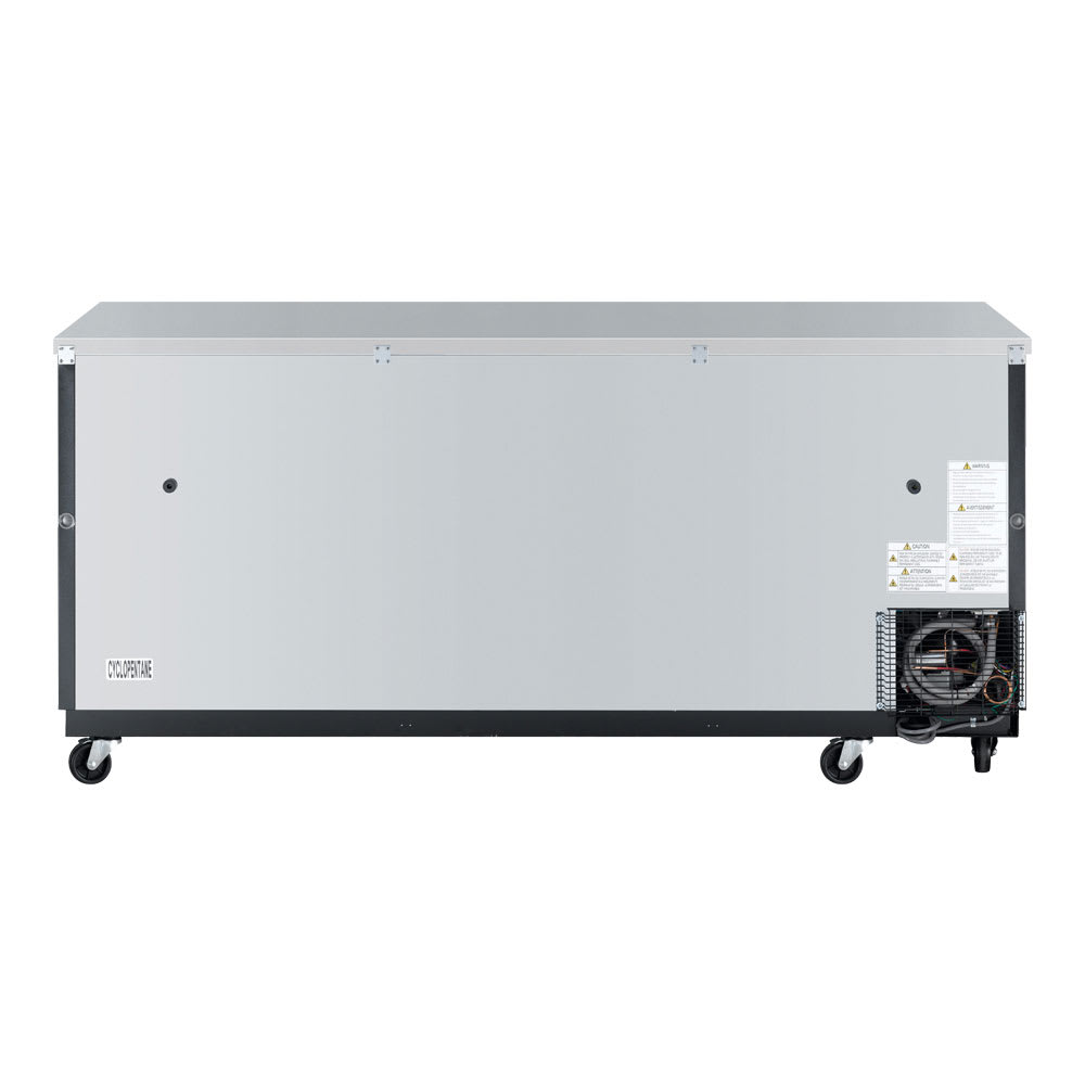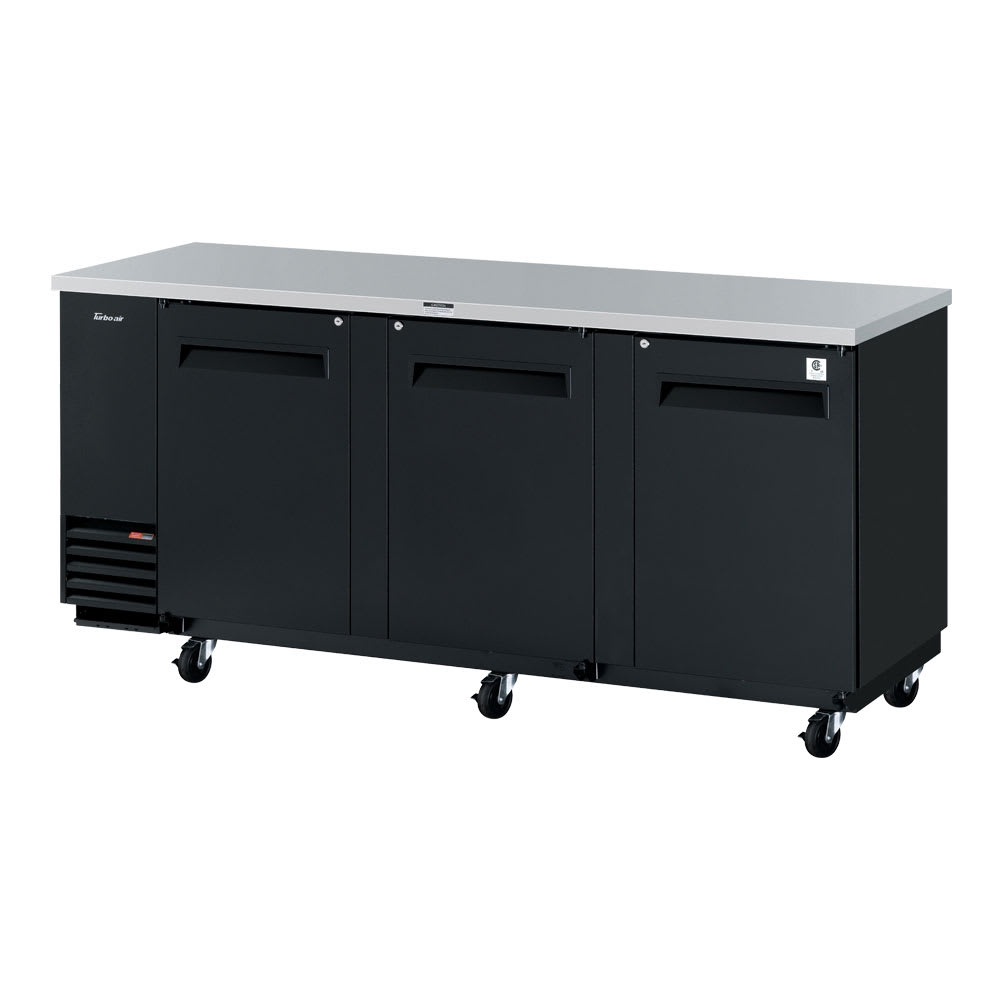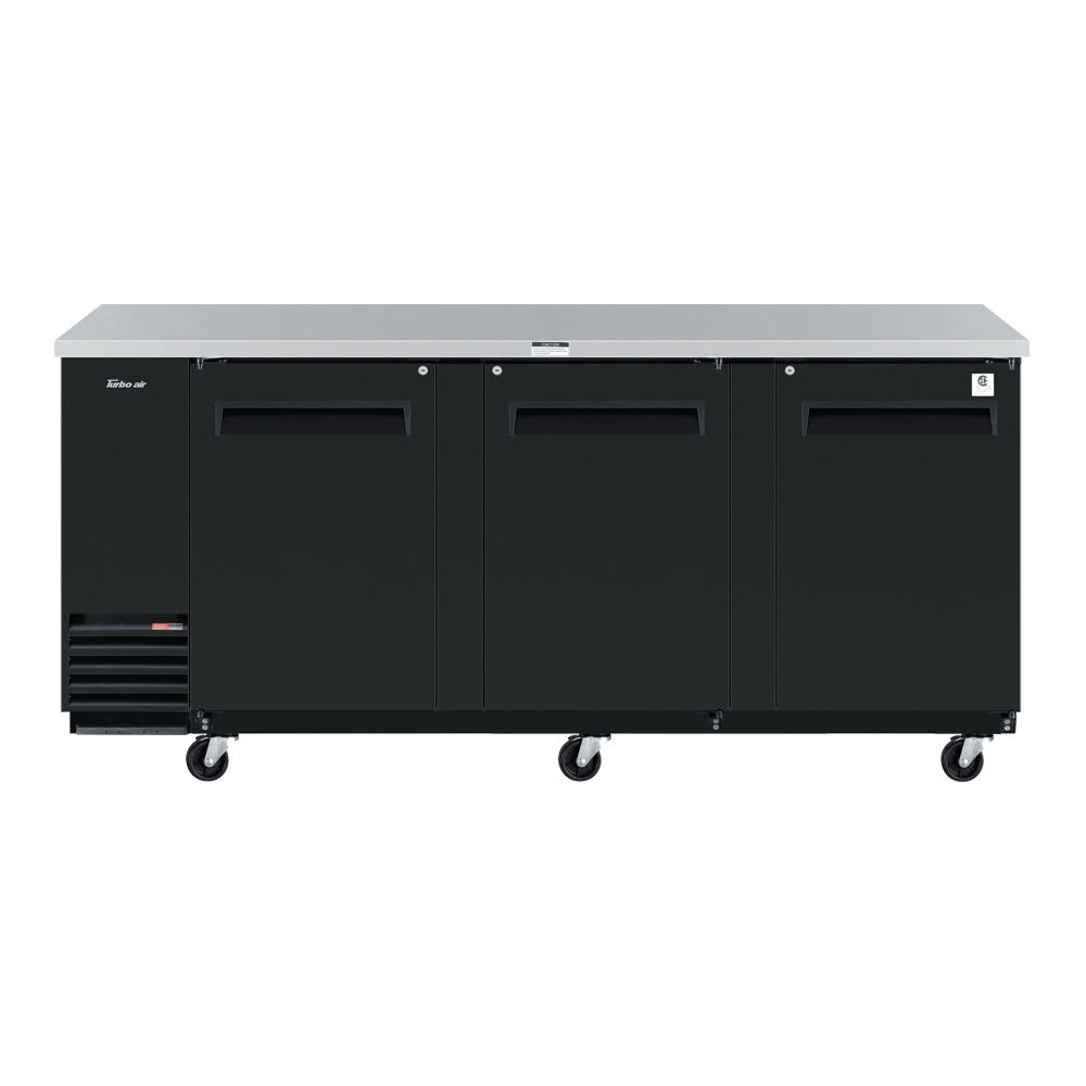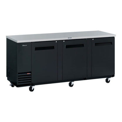Back Bar Cooler, three-section, 90-3/8″W x 27-1/4″D x 37-1/8″H, 36.47 cu.ft., self-cleaning condenser equipped, self-contained, side mount, front breathing, (8) PE coated adjustable shelves, LED interior light, stainless steel countertop & black laminated exterior, stainless steel door liners & interior floor, white powder coated galvanized steel interior top & inside walls, (3) doors with locks, R290 Hydrocarbon refrigerant, 1/3 HP, 115v/60/1-ph, 2.9 amps, cord, NEMA 5-15P, cETLus, ETL-Sanitation, ENERGY STAR¬¨√Ü