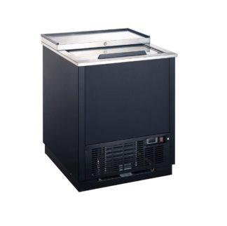 Glass Chiller & Froster, 24-7/8″W, 4.39 cu.ft., self-cleaning condenser equipped, side mount, self-contained, (2) PE coated durable shelves, (1) sliding lid, stainless steel countertop & lid, black laminated exterior, stainless steel inside walls & floor, galvanized steel interior top, R600a Hydrocarbon refrigerant, 1/8 HP, 115v/60/1-ph, 0.9 amps, NEMA 5-15P, cETLus, ETL-Sanitation