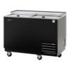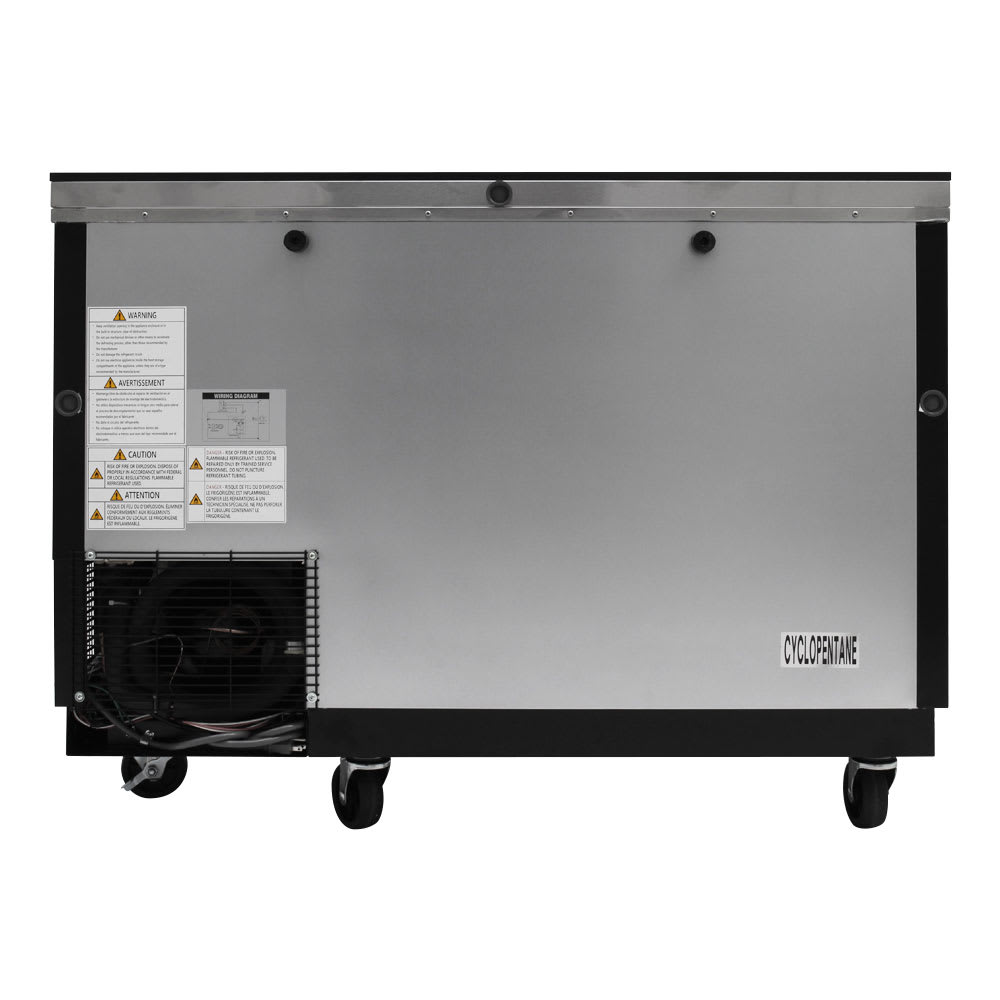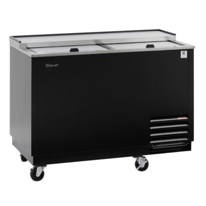 Super Deluxe Glass Chiller & Froster, 50″W, 13.85 cu.ft., self-cleaning condenser equipped, side mount, self-contained, (5) PE coated durable shelves, (2) sliding lids, stainless steel countertop & lid, black steel exterior, stainless steel inside walls & floor, galvanized steel interior top, (5) casters standard, R290 Hydrocarbon refrigerant, 1/3 HP, 115v/60/1-ph, 1.7 amps, NEMA 5-15P, cETLus, ETL-Sanitation