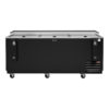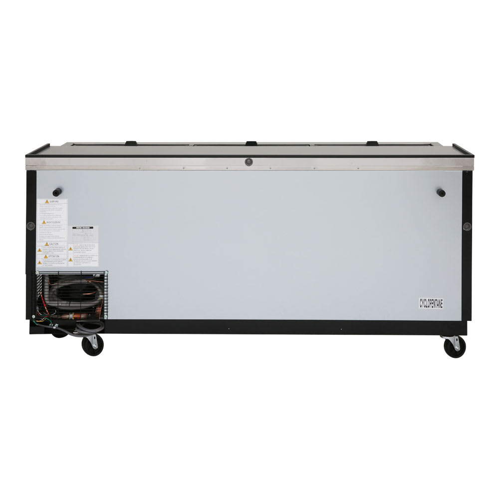 Bottle Cooler, 80.50″W, 22.6 cu.ft., self-cleaning condenser equipped, self-contained, (5) PE coated adjustable dividers, built-on removable bottle cap opener & catcher, (3) sliding lids, stainless steel countertop & lid, black laminated exterior, stainless steel inside walls & floor, galvanized steel interior top, side mount compressor, front breathing, (7) casters standard, R290 Hydrocarbon refrigerant, 1/3 HP, 115v/60/1-ph, 2.5 amps, NEMA 5-15P, cETLus, ETL-Sanitation