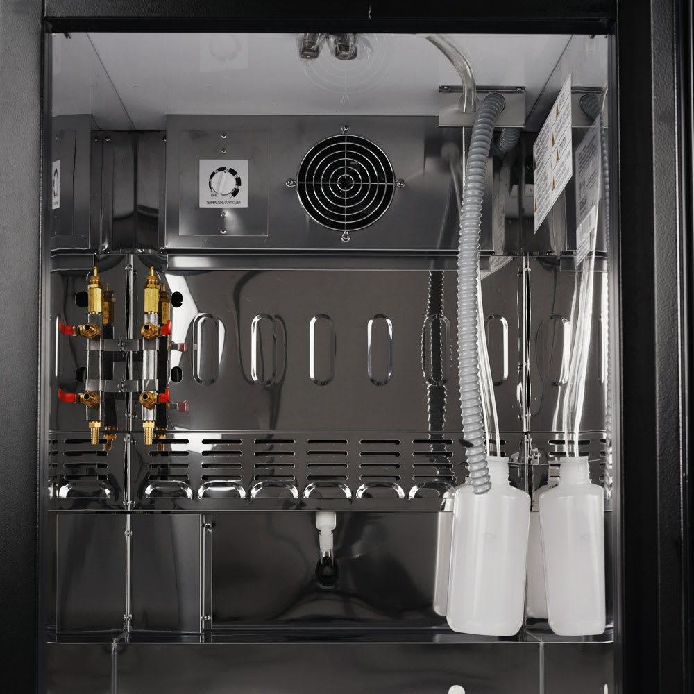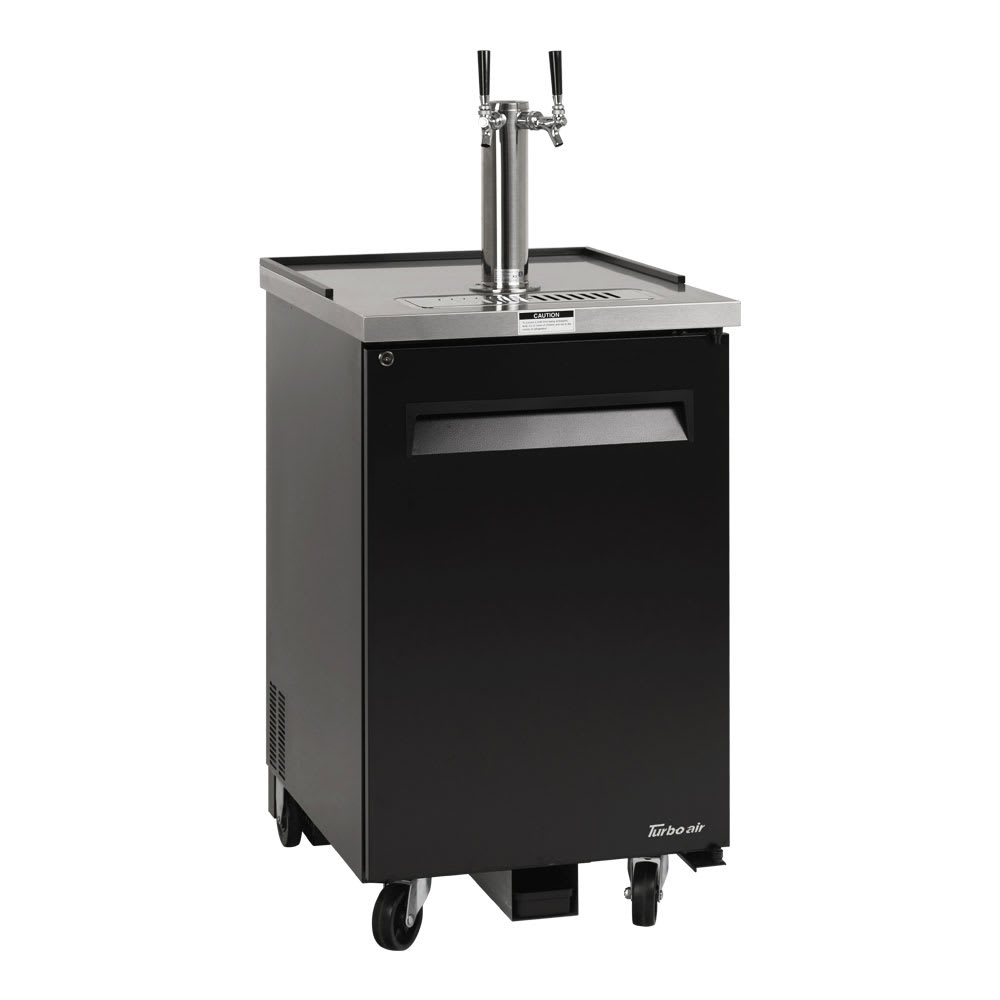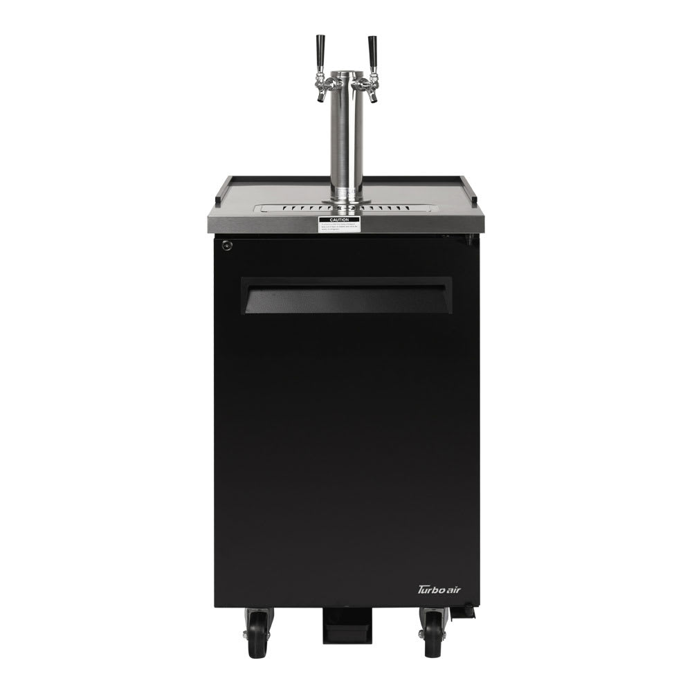 The Turbo Air TBD-1SB-N6 draft beer system holds one half-barrel keg and, with its 311/4-inch interior height, the cabinet accommodates different keg models. There is a single 3-inch-diameter insulated beer tower with a double faucet, so it can dispense more beer at once. A two-way tapper manifold connects the multiple lines to a single carbon dioxide tank. With a forced-air cooling system, cold air is distributed throughout the cabinet quickly and evenly. The door is easy to open since it has an ergonomically-designed handle, but it can be locked to prevent unauthorized access. Blending into a variety of themes, the Turbo Air TBD-1SB-N6 draft beer system has a heavy-duty black exterior finish.