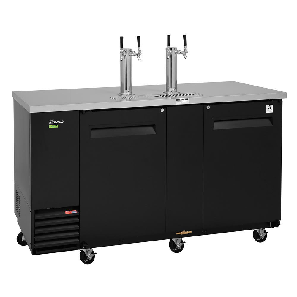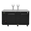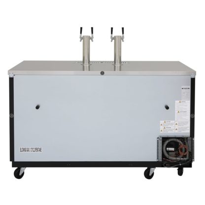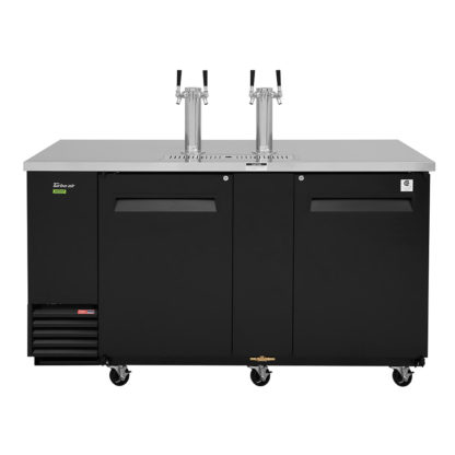 Super Deluxe Beer Dispenser, 69-1/8″W, self-cleaning condenser equipped, (2) swing doors with locks, stainless steel countertop & black exterior, stainless steel inside walls & floor, galvanized steel interior top, (3) 1/2 barrel capacity, (2) 3″ dia. stainless steel insulated beer columns with double faucet, door locks, recessed handles, side mount, front breathing, R290 Hydrocarbon refrigerant, 1/3 HP, 115v/60/1-ph, 2.5 amps, NEMA 5-15P, ETL-Sanitation, cETLus, ENERGY STAR¬¨√Ü