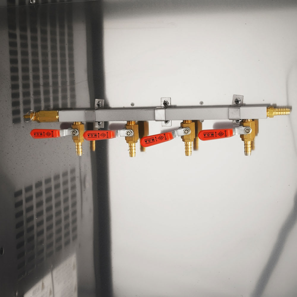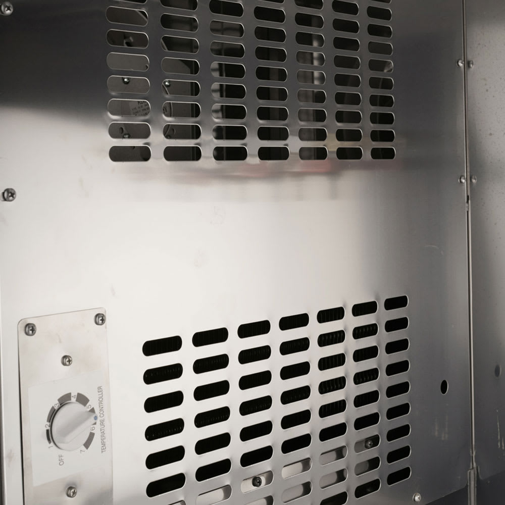 Debris is removed from the condenser by a built-in device that brushes it every 24 hours. To keep temperatures cool, the Turbo Air TBD-4SD-N kegerator uses R290 hydrocarbon refrigerant. A forced-air cooling system pushes cold air throughout the cabinet, ensuring all product is evenly chilled. Its evaporator has a corrosion-resistant coating, and its compressor can be accessed through the side.