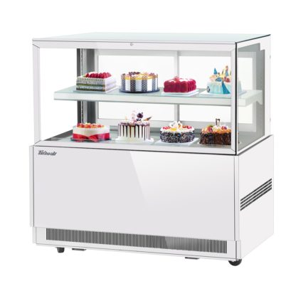 Refrigerated Bakery Display Case, 59″W x 27-1/2″D x 46-1/4″H, 15.7 cu. ft. capacity, self-contained refrigeration with self-cleaning condenser, straight tilt-out tempered glass front, tempered glass side pannels, sliding rear doors, digital temperature controller, (1) adjustable tempered glass shelf with stainless steel front & back edges, LED interior lighting, stainless steel interior, specify exterior color, 3″ swivel casters (rear locking), R290 Hydrocarbon refrigerant, 3/4 HP, 115v/60/1-ph, 7.3 amps, cord with NEMA 5-15P, cETLus, ETL-Sanitation