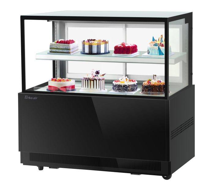 Refrigerated Bakery Display Case, 59″W x 27-1/2″D x 44″H, 15.7 cu. ft. capacity, self-contained refrigeration with self-cleaning condenser, straight tilt-out tempered glass front, tempered glass side pannels, sliding rear doors, digital temperature controller, (1) adjustable tempered glass shelf with stainless steel front & back edges, LED interior lighting, stainless steel interior, specify exterior color, 3″ swivel casters (rear locking), R290 Hydrocarbon refrigerant, 3/4 HP, 115v/60/1-ph, 6.5 amps, cord with NEMA 5-15P, cETLus, ETL-Sanitation