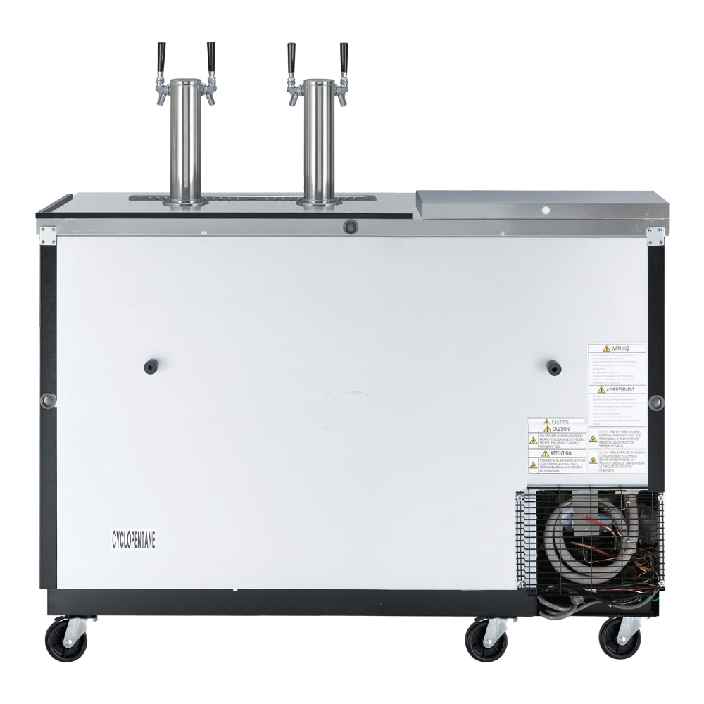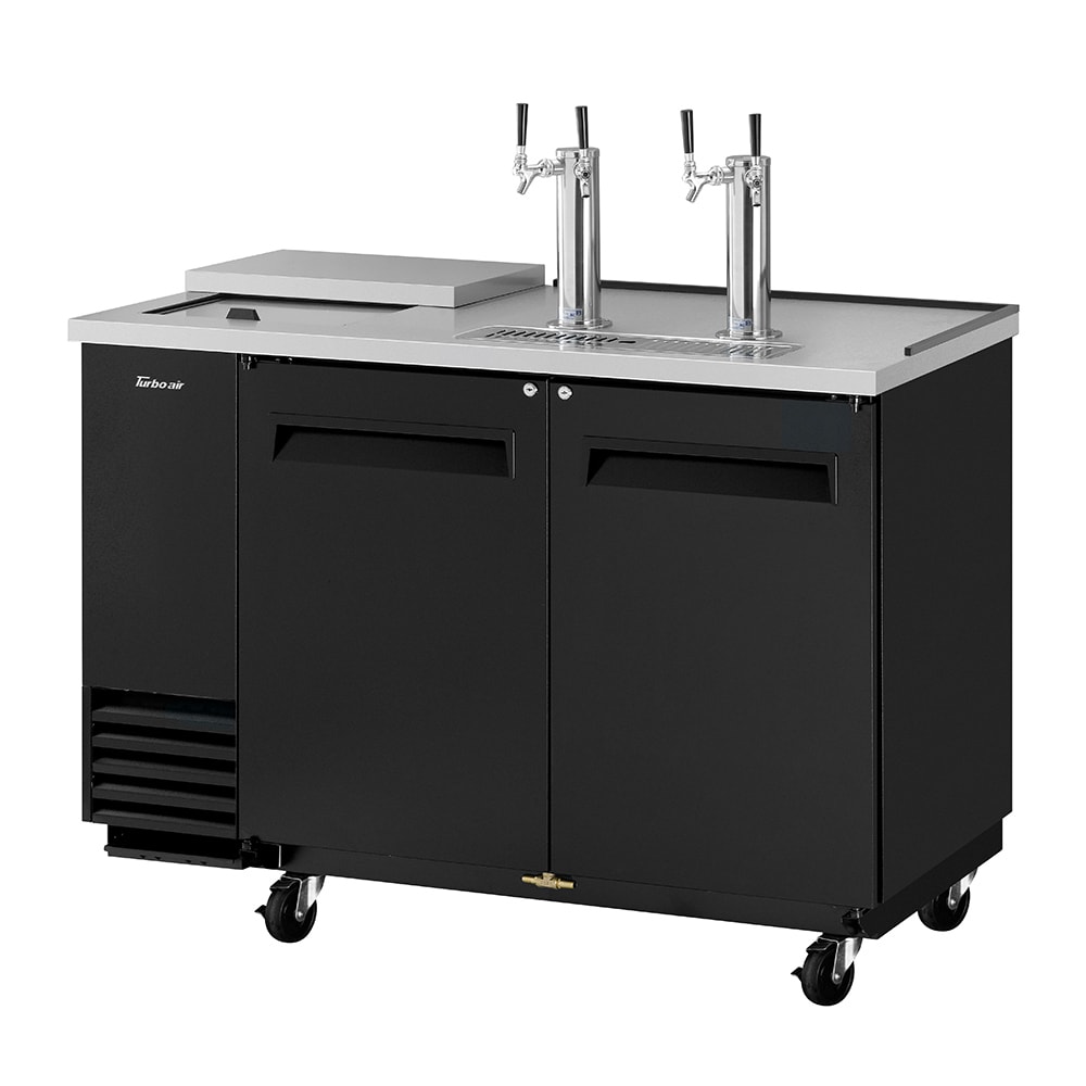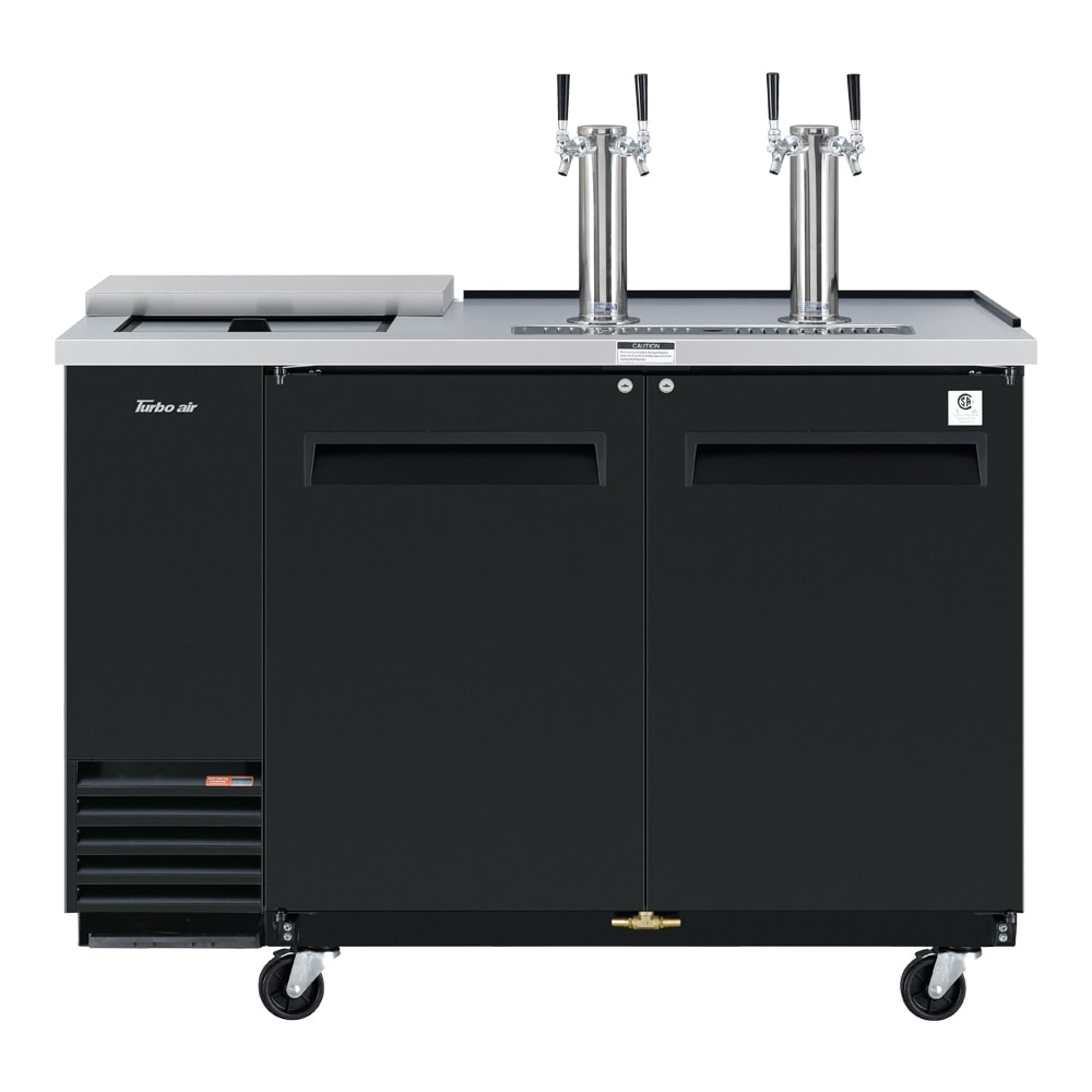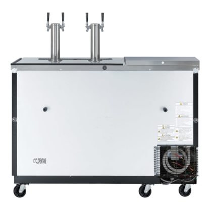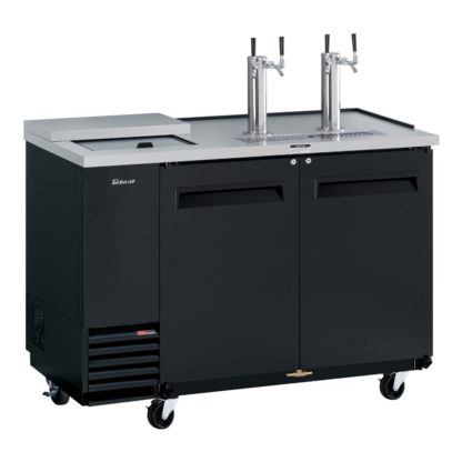 Club Top Beer Dispenser, 58-7/8″W, self-cleaning condenser equipped, (2) swing doors with locks, stainless steel countertop & black laminated exterior, stainless steel inside walls & floor, galvanized steel interior top, (2) 1/2 barrel capacity, (2) 3″ dia. stainless steel insulated beer columns with double faucet, door locks, recessed handles, side mount, front breathing, R600a Hydrocarbon refrigerant, 1/5 HP, 115v/60/1-ph, 1.3 amps, NEMA 5-15P, cETLus, ETL-Sanitation, ENERGY STAR¬¨√Ü