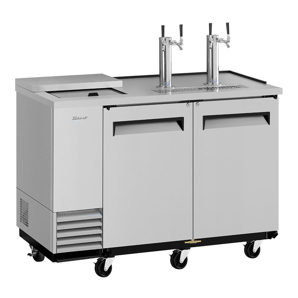 The Turbo Air TCB-2SDD-N6 draft beer system has a device on the condenser that removes dust buildup once a day. Its forced-air system distributes cold air so that all product is cooled evenly. This unit holds two half-barrel kegs and dispenses beer through two towers with four taps. Operators can access the interior through two doors that lock to limit access. Further ensuring product stays cold, steins and mugs can be chilled in the club top. The Turbo Air TCB-2SDD-N6 draft beer system has a stainless steel exterior that resists corrosion and adds durability.