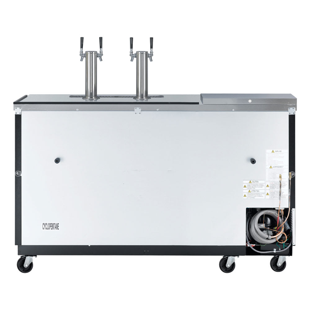 Club Top Beer Dispenser, 69-1/8″W, self-cleaning condenser equipped, (2) swing doors with locks, stainless steel countertop & black laminated exterior, stainless steel inside walls & floor, galvanized steel interior top, (3) 1/2 barrel capacity, (2) 3″ dia. stainless steel insulated beer columns with double faucet, door locks, recessed handles, side mount, front breathing, R600a Hydrocarbon refrigerant, 1/5 HP, 115v/60/1-ph, 2.3 amps, NEMA 5-15P, cETLus, ETL-Sanitation, ENERGY STAR