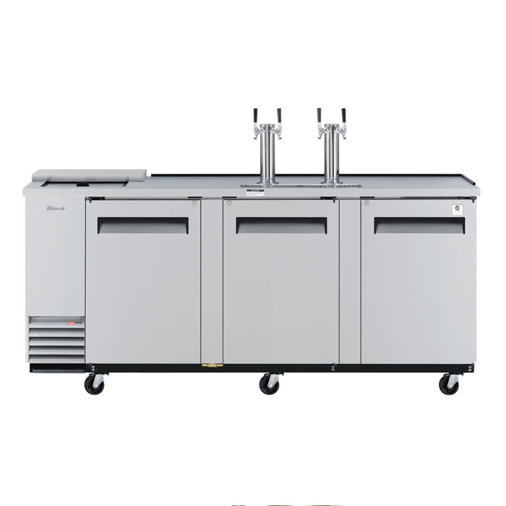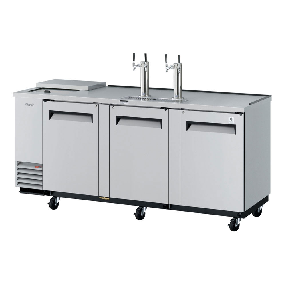The Turbo Air TCB-4SDD-N Super Deluxe draft beer system dispenses from two taps on two 3-inch-diameter beer towers thanks to the four-way tapper manifold, allowing establishments to increase their output. The cabinet accommodates four half barrel kegs, and with a 32-inch interior height, the cabinet holds a variety of keg sizes. Comfort is provided when opening the three doors with the ergonomic handle design. Accessing the interior is simple since there is a sliding lid club top, so glass and mugs can easily be chilled. Foamed-in-place insulation keeps cold air inside the cabinet and creates structure.
