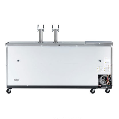 Super Deluxe Club Top Beer Dispenser, 90-3/8″W, self-cleaning condenser equipped, (3) swing doors with locks, stainless steel countertop & exterior, stainless steel inside walls & floor, galvanized steel interior top, (4) 1/2 barrel capacity, (2) 3″ dia. stainless steel insulated beer columns with double faucet, door locks, recessed handles, side mount, front breathing, R290 Hydrocarbon refrigerant, 1/3 HP, 115v/60/1-ph, 2.6 amps, NEMA 5-15P, cETLus, ETL-Sanitation, ENERGY STAR¬Æ