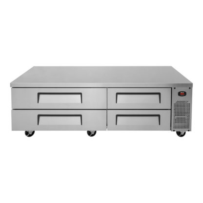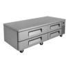 The Turbo Air TCBE-72SDR-N chef base refrigerator’s side-mount compressor enables the unit to be serviced without moving it. This chef base comes with four strong drawers, each of which has a recessed handle to inhibit employee fatigue. Each drawer holds sixth-size pans, and altogether the unit can hold 48 pans. Facilitating cleaning, the front and sides are made of stainless steel, and the unit’s casters measure 5 inches. It uses environmentally-friendly R290 hydrocarbon refrigerant.